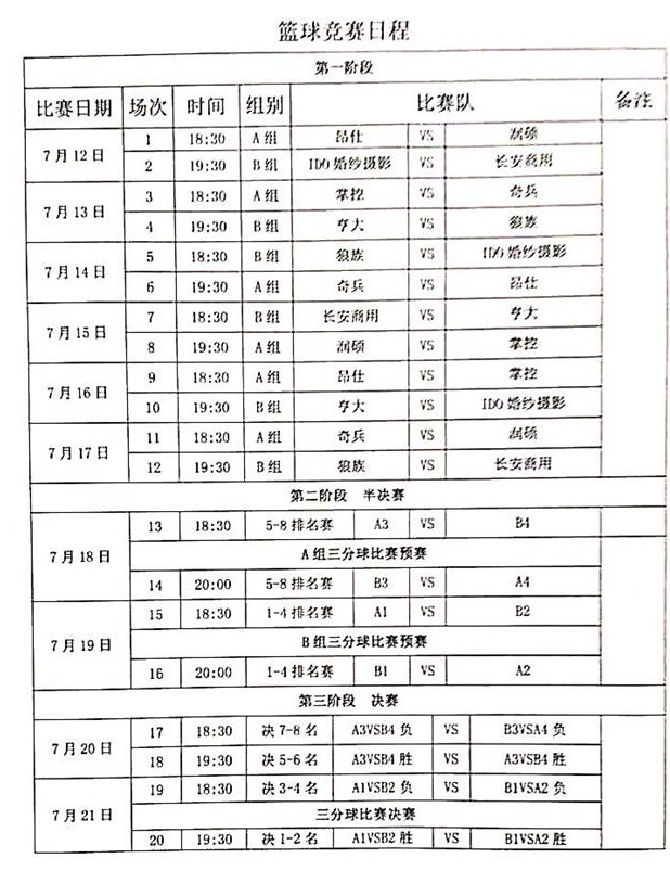 2017年7月12日,由市籃球協(xié)會(huì)組織舉辦的2017年“昂仕杯”籃球比賽在金牛山籃球場(chǎng)正式拉開(kāi)帷幕。具體賽程如圖所示,歡迎廣大籃球愛(ài)好者屆時(shí)到現(xiàn)場(chǎng)觀賽助威。